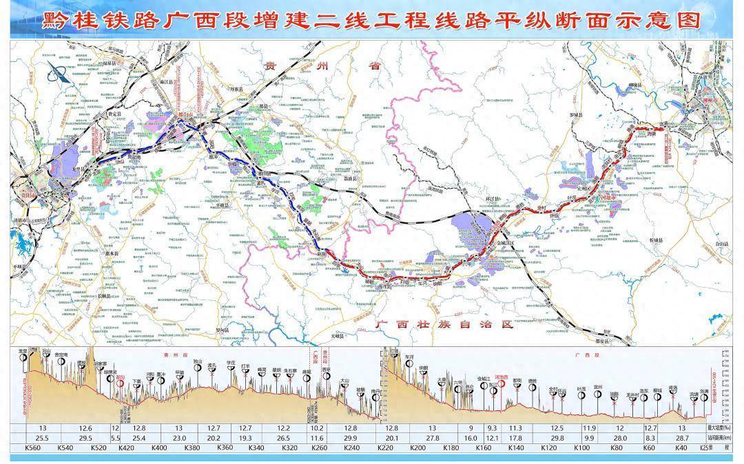 据公示,黔桂铁路增建二线工程位于广西西北部,自柳州枢纽洛满站引出,按照预留二线位置沿既有线增建第二线,经河池市宜州、金城江站、南丹至贵州省界。